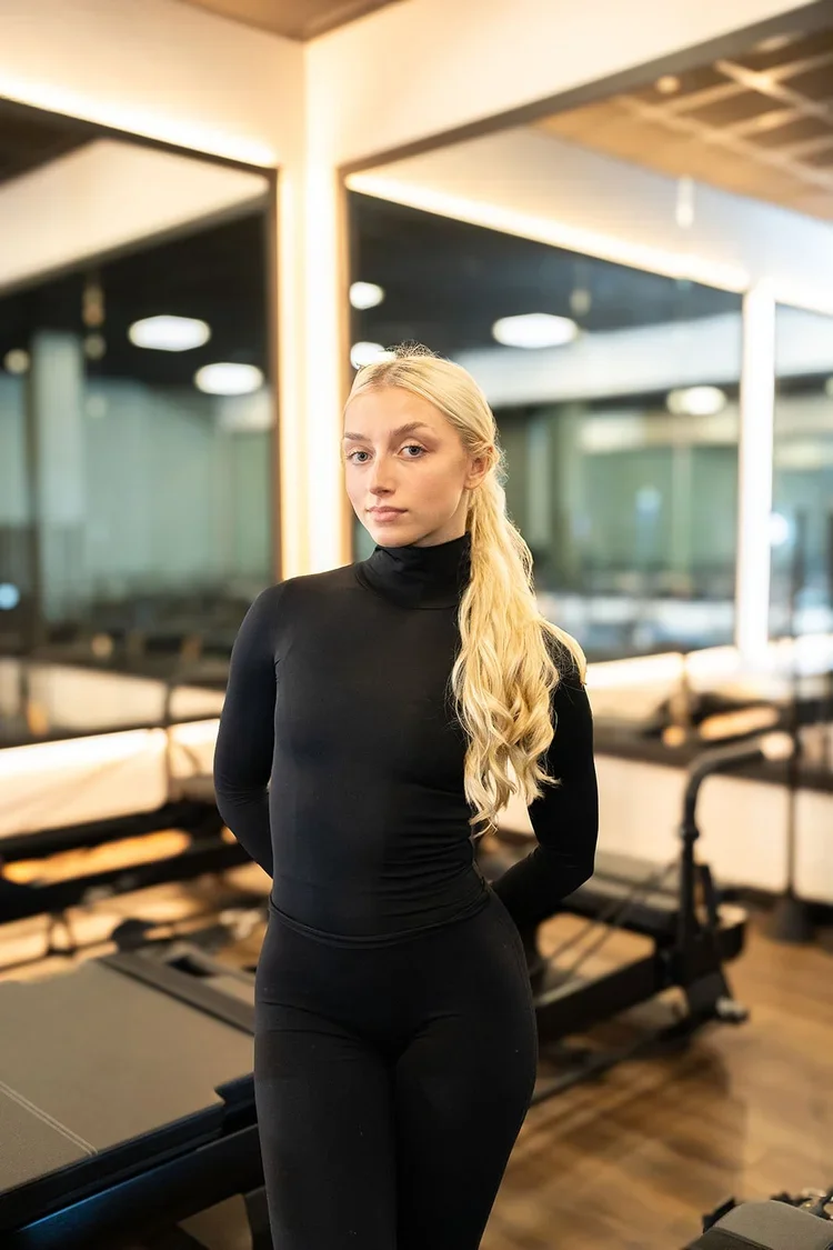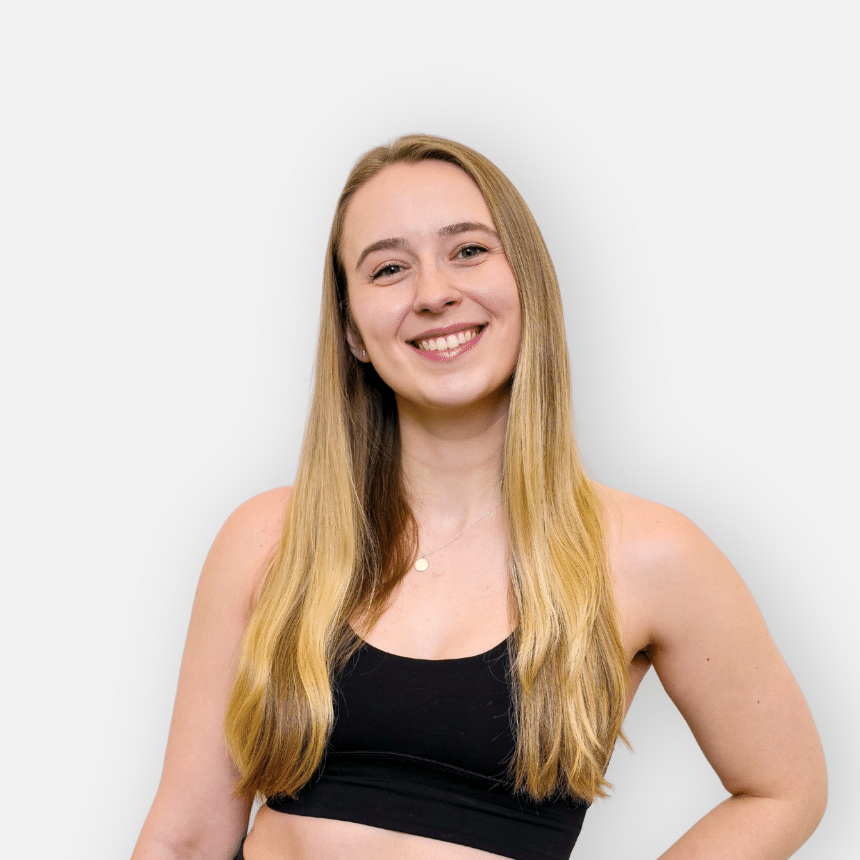 Juliana standing in front of a white wall wearing a black sports bra and leggings with an excited and welcoming expression on her face.
